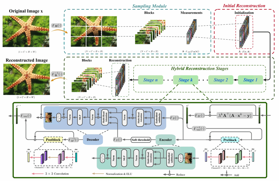 在“TransCS: A Transformer-Based Hybrid Architecture for Image Compressed Sensing”文章(IEEE TIP)中,作者提出了一种基于Transformer的图像压缩感知架构TransCS。在采样模块中,TransCS采用了可训练的感知矩阵策略,通过学习自然图像的先验结构信息来获得更好的图像重建质量。受到稀疏性诱导的启发,在重建模块中设计了一种基于迭代收缩阈值算法ISTA的Transformer架构,对图像子块之间的全局依赖性进行建模,并通过梯度下降和软阈值操作迭代恢复原始图像。实验结果表明,与其他最先进的方法相比,所提出的TransCS不仅具有较强的可解释性,而且在公共数据集上获得了高速的重建速度、更优越的图像重建质量和噪声鲁棒性。论文链接: