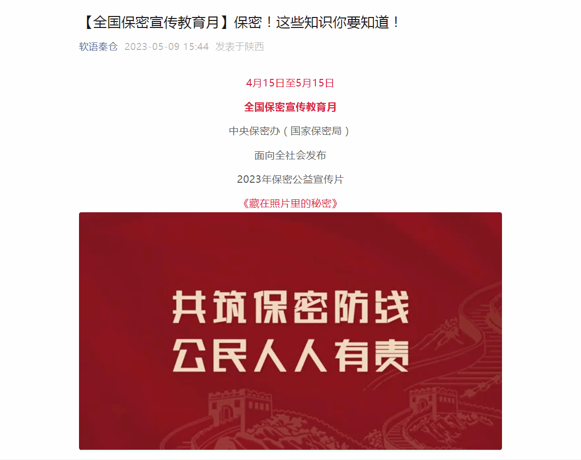 还利用官微平台、电子屏幕等载体,多形式、多渠道推送、播放保密公益宣传片、保密提醒标语等,开展保密宣传教育,积极营造“人人学保密、人人知保密”的浓厚学习氛围。