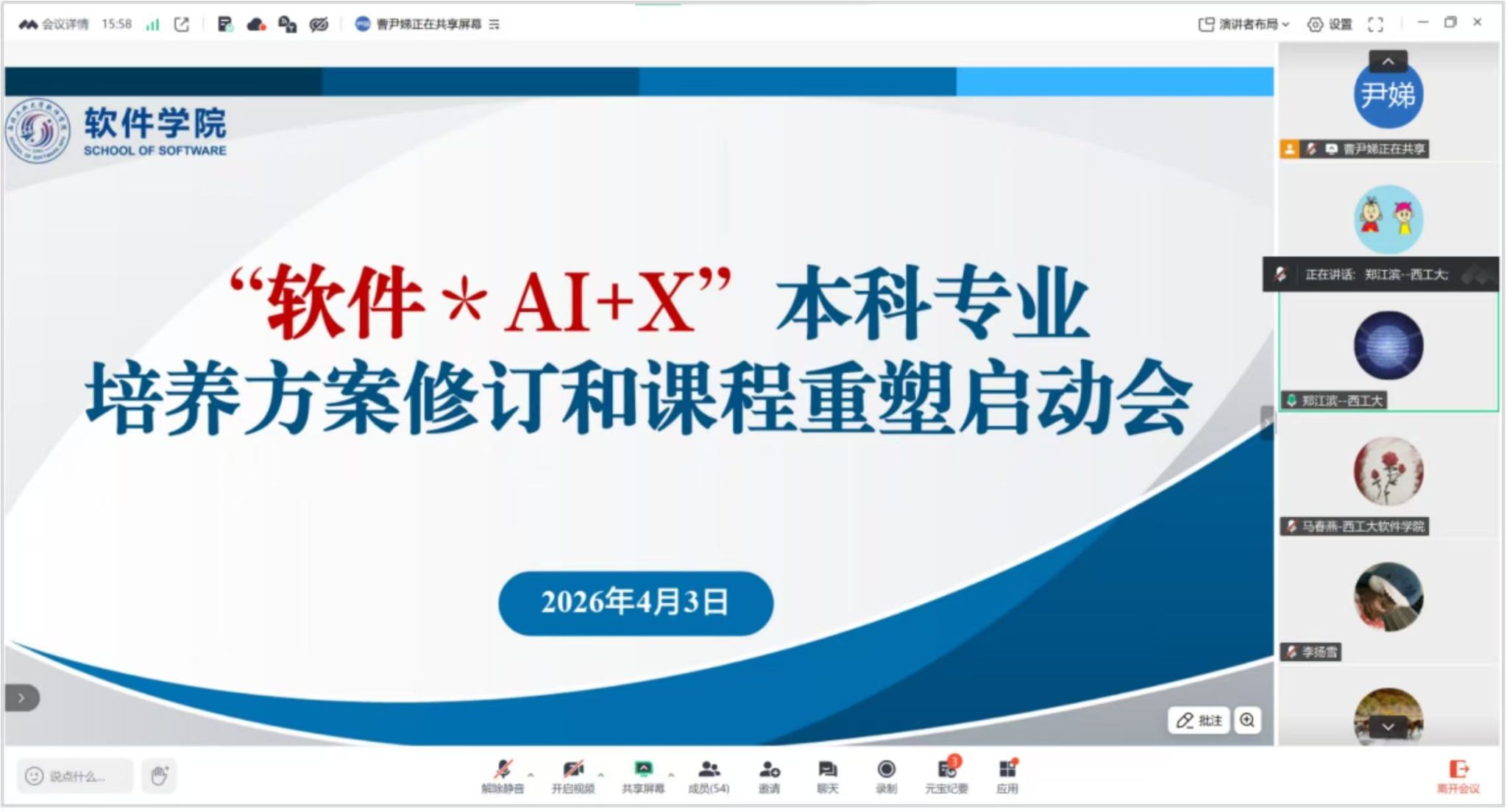 骰宝游戏 积极响应骰宝游戏 教务部关于培养方案修订的工作部署,坚持以“总师育人文化”为引领,主动应对人工智能时代对软件工程人才培养带来的冲击与挑战,不断推进AI赋能下的“总师型”人才培养模式探索。2026年4月3日上午,骰宝游戏 线上召开全体教师大会,正式启动“软件*AI+X”本科专业培养方案修订和课程重塑工作。院长郑江滨、党委书记李晗、副院长马春燕等出席会议,全体教师参加。会议由马春燕主持。