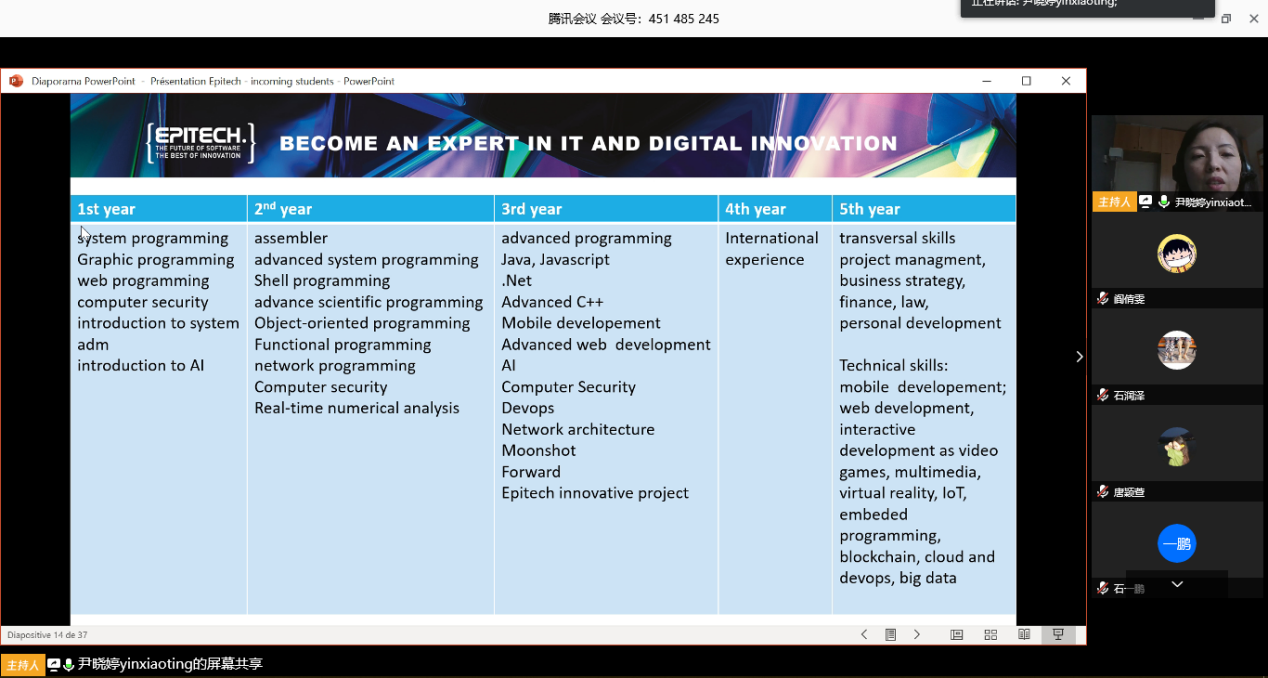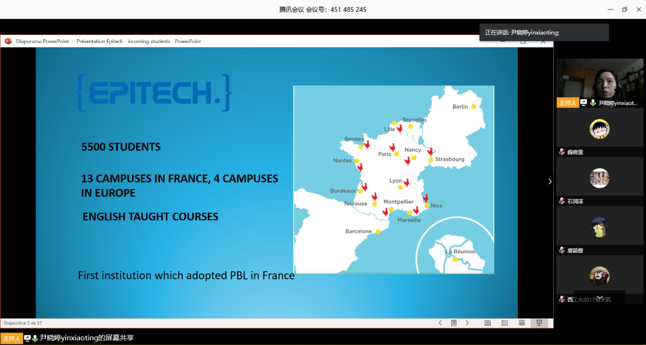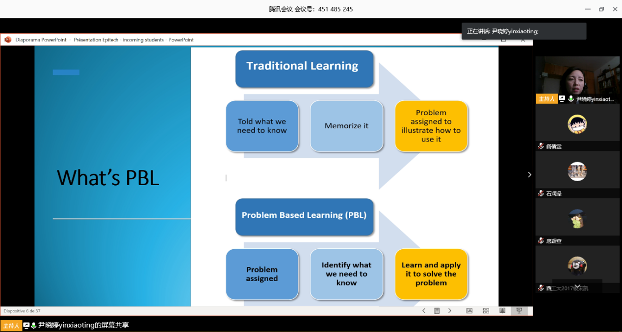 的部分学生参加了本次线上宣讲会。尹老师在法国从事计算机软件专业的国际教育合作多年,曾就职于中国驻外使馆经济商务处,并获得法国MBA工商管理硕士,对PBL (Project-based Learning) 教育模式与教学创新有深刻的认知,具有丰富的国际教育合作经验。