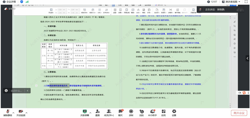 郭艳静为2022级学生解读了选课通知、选课指导性教学计划、课程认定办法及GPA计算方式,强调了预置课程、补选课程、退选课程得重要性,确保每位学生都能科学合理地规划自己的修读课程;针对2021级准大四学生,她详细讲解了培养方案完成要求、毕业资格审查时间表及毕业结论等,帮助学生们提前完成学业情况自查,并解答了毕业审查相关问题,为学生们提供了清晰的毕业路径指引,确保其顺利毕业。