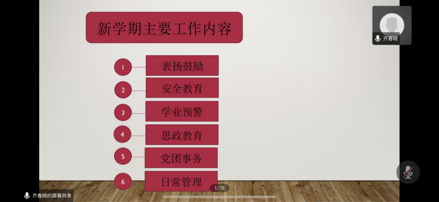 最后,齐老师对本学期的主要工作安排进行讲述。新学期工作内容主要从安全教育、学业预警、日常管理等方面开展。由于目前疫情情况还不稳定,齐老师提醒大家日常要做好防护,每日安全健康报,务必配合骰宝游戏