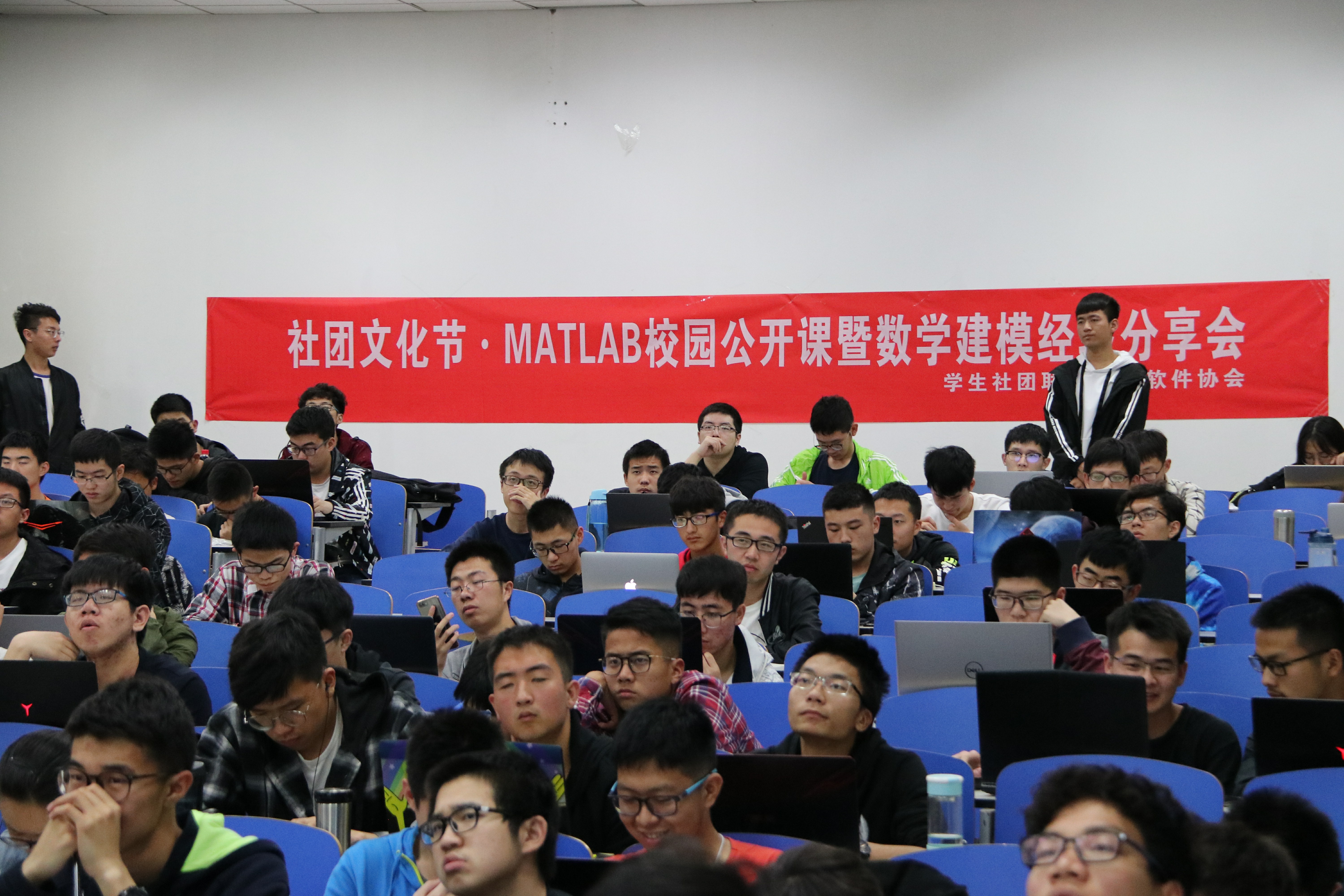 五一数模节,提升学生参与比赛积极性,2019年4月20日,软件协会与学生社团联合会于教学东楼D座205举办的MATLAB校园公开课。本次课程的三位主讲人分别为:软件协会组织部部长田皓哲、数模协会会长李永奇及获得全国大学生数学建模竞赛一等奖的黄雅莹同学。在前期各个宣传工作的铺垫下,本次公开课实际参与人数超出预期人数。