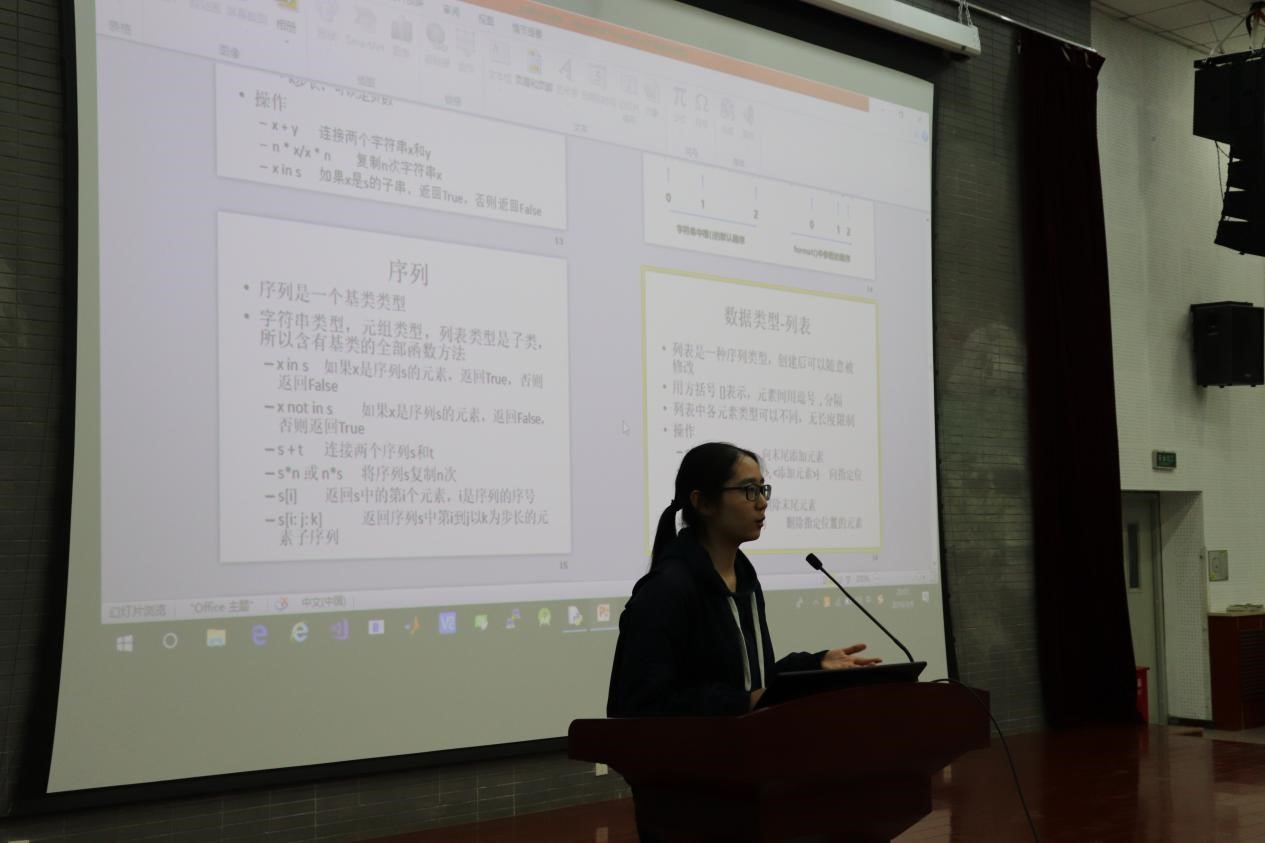 2017级本科生、足球基地人形组成员、软件协会项目部部长丁越,她为我们讲解了Python的基础入门课程。
