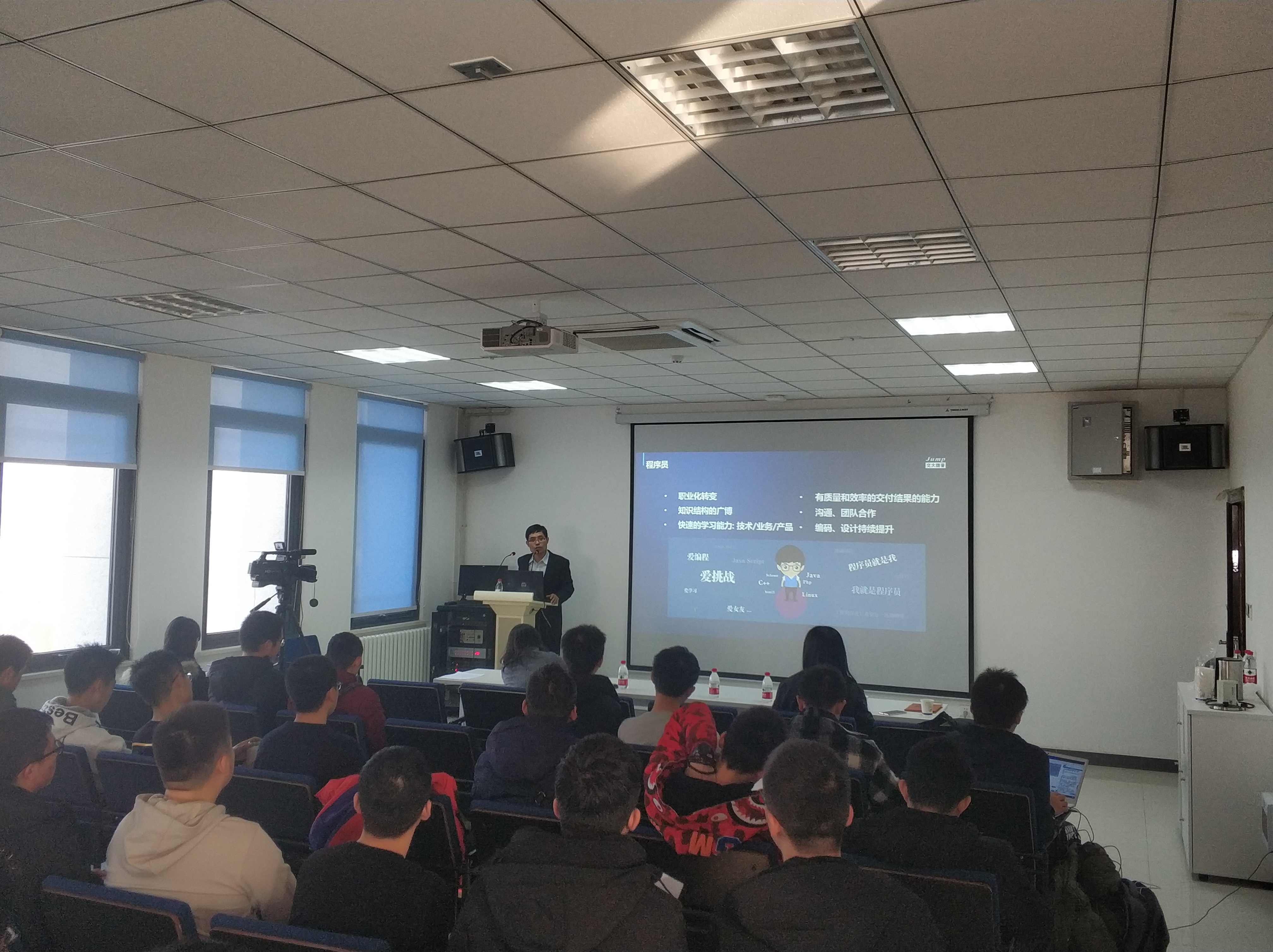 随后,何建锋讲述了自己的工作经历——从程序员,项目经理,技术研发部主任,到CTO的成长之路,他从一次次教训中总结经验努力拓展知识、深入学习,从技术人员成功成长为一名企业经营者。通过自己的经历,何建锋建议同学们重视培养快速学习的能力、有质量和效率的交付结果的能力、与同事合作沟通的能力、借助一切可以借助力量的能力,要在职业生涯中逐步明确自己的目标,不断提升自己,完成职责之路的规划和角色转变。
