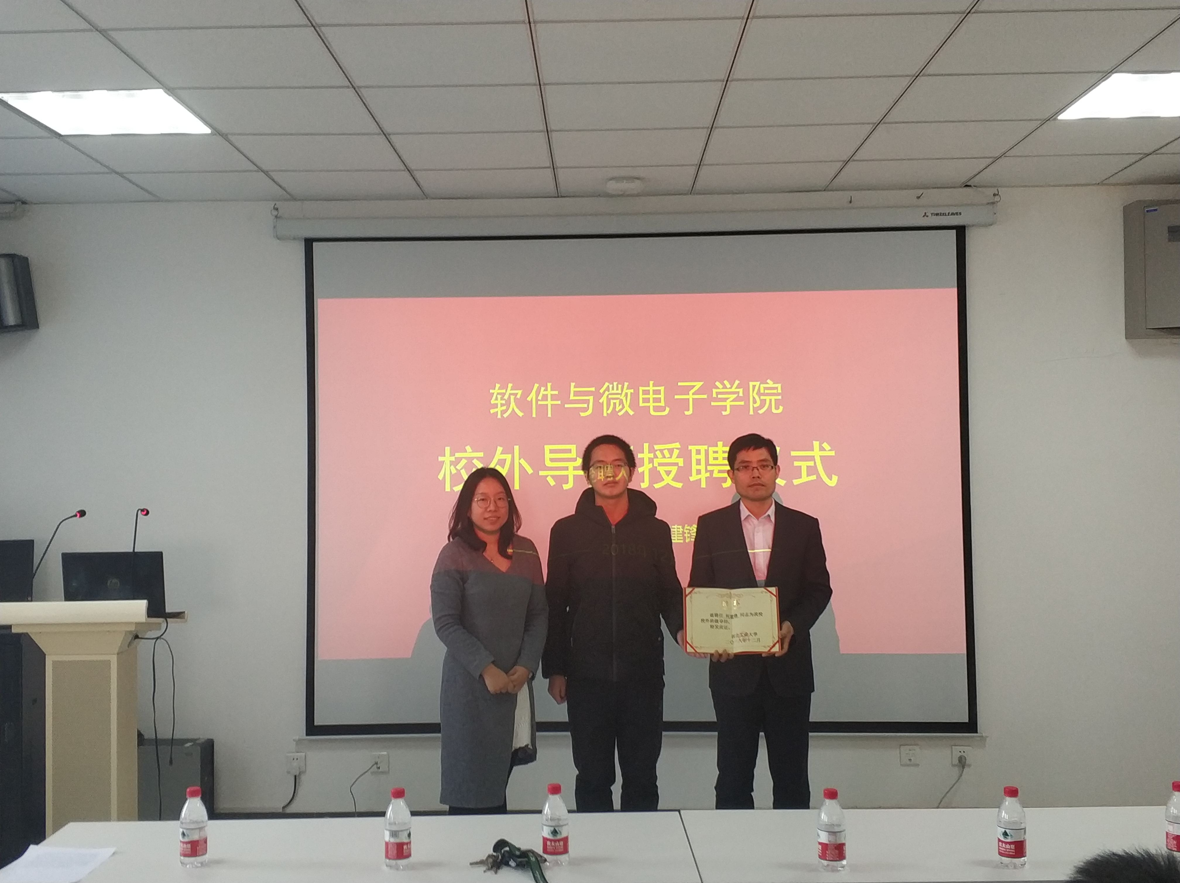 向何建锋颁发了聘书并表示祝贺,希望作为校外导师能够指导同学们在学业、竞赛、工程实践等方面更上一层楼