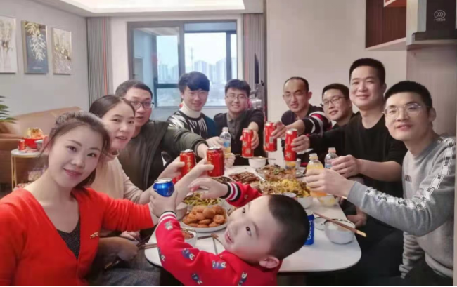 两位家庭大厨团结协作,经历四个小时,为大家精心制作了满满一桌丰盛的年夜饭:回锅肉,大肘子,烤鸡翅,炸年糕等一应俱全,大家围坐在一起,享受着美味可口的饭菜,畅谈着学习和工作,展望新年的奋斗目标,共同举杯庆祝新春佳节。