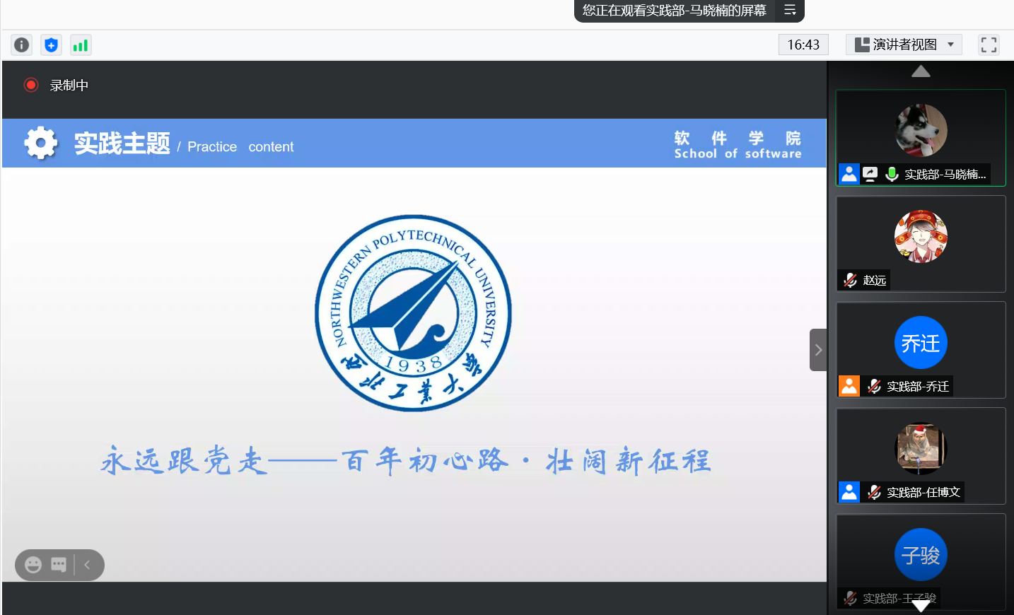动员会主要分为“实践主题”、“实践内容”、“实践形式”、“工作安排”四个方面,最后安排了答疑环节。关于“实践主题”,实践部马晓楠首先为大家讲解了本次实践的指导思想,介绍分析了实践活动的主题,强调实践应切合“永远跟党走——百年初心路·壮阔新征程”的实践主题,使同学们了解社会实践的深远意义。