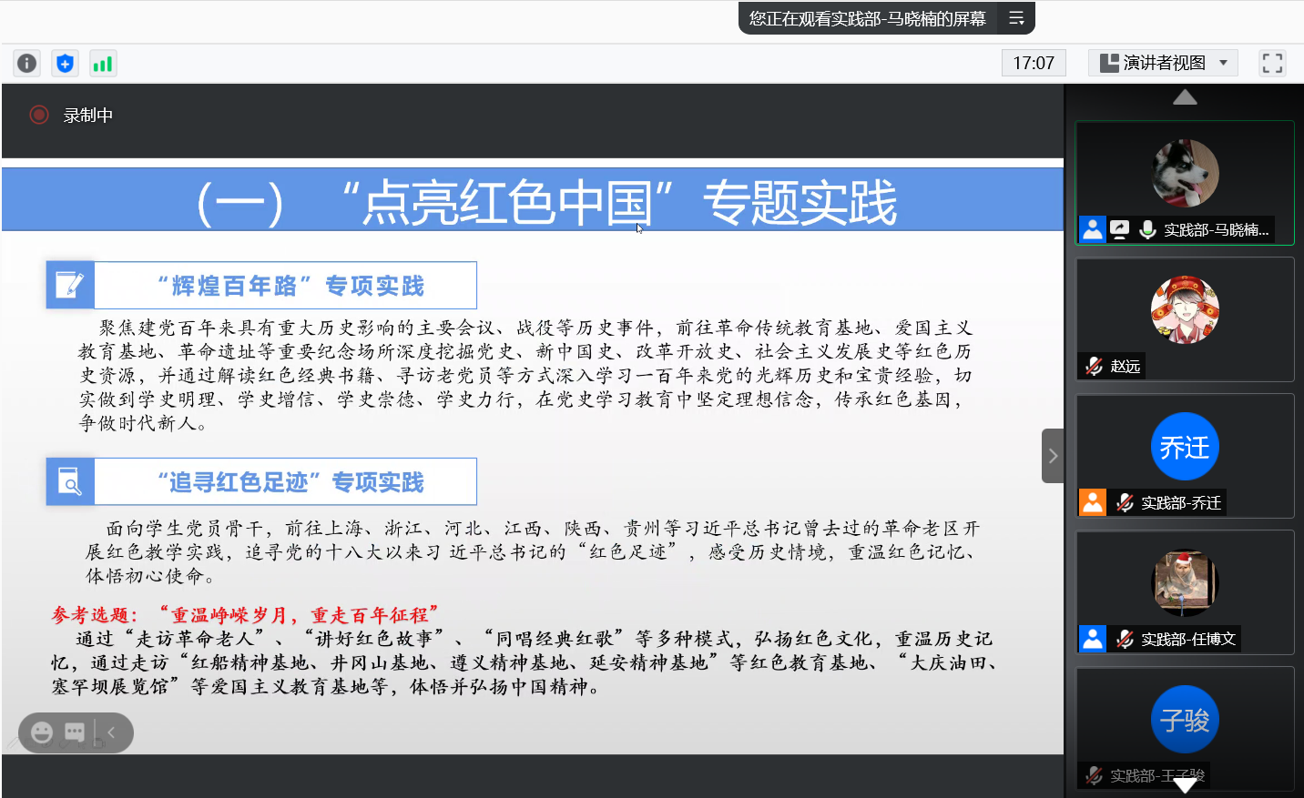 接下来的“实践内容”则是重中之重,实践部马晓楠详细地介绍了实践活动的五大专题“点亮红色中国”,“乡村振兴”,“工大烙印”,“青年观察家”,“奋斗青春”,并针对不同专题内容进行解剖,列举了一些选题参考和实践项目实例,为同学们提供了具体易理解的破题思路,便于后续的实践立项。