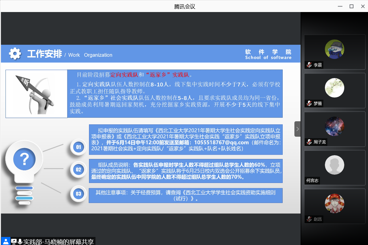 暑期社会实践动员会顺利落下帷幕。本次会议旨在解读实践通知、答疑相关问题,会议由实践部乔迁主持,实践部工作人员及2020级学生参与本次线上会议。