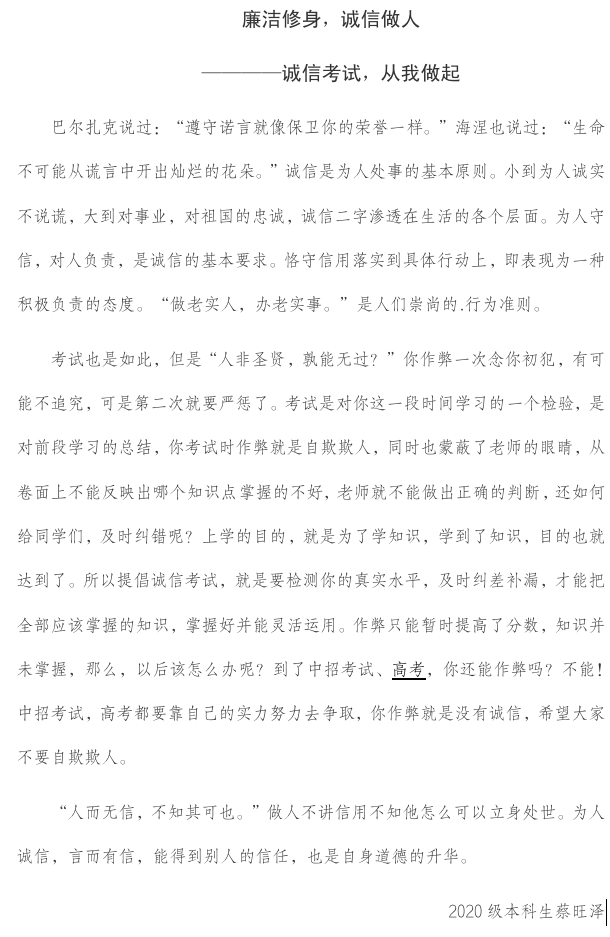 2019级本科生雷京宾写道“作为新时代大学生,更应做到心中有戒,践行清正廉洁。每天都要和金钱打交道的我们,必须时时刻刻保持清醒的头脑,树立正确的世界观、人生观和价值观”;2020级本科生孙秀硕从“廉以修身,诚以养德”展开自己对廉和信的认识;2020级本科生蔡旺泽从诚信考试的主题出发写道“人而无信,不知其可也。”做人不讲信用不知他怎么可以立身处世。为人诚信,言而有信,能得到别人的信任,也是自身道德的升华。”