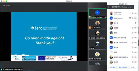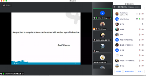 暑期国际学堂工作小组积极准备课程相关事宜,与课程助教以及授课教授进行沟通协调,确保线上课程的顺利进行,并于2021年7月14日顺利开课。在为期5天的线上课程中,来自爱尔兰利默里克大学的Mike Hinchey教授通过腾讯会议进行线上授课,向同学们展示了软件系统的发展历史以及未来趋势,并且提出了目前一些阻碍软件工程领域持续发展的困难和挑战,激发了学生对于任务关键型软件系统演化以及其他前沿的软件系统演化方式的思考与探究。