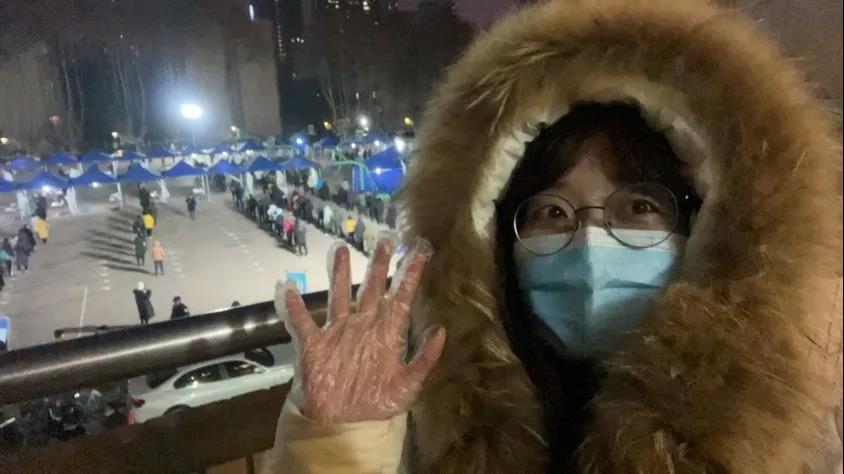 在参与核酸检测排队情况实时播报工作中,冯钰晴负责拍照记录并发送实时消息告知排队的同学。气温降至零下,寒风凛冽,为减少同学们的等待时间,志愿者们坚守岗位完成工作。