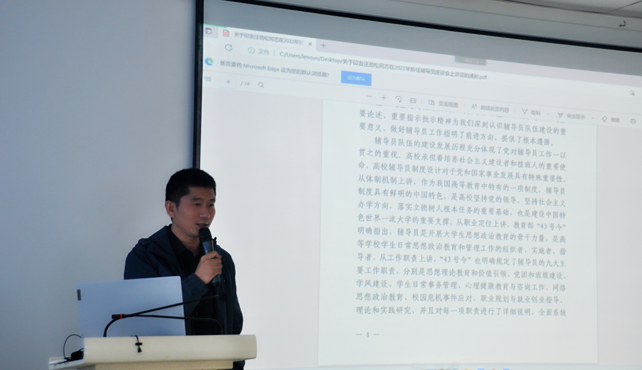 李晗在传达学习《汪劲松校长在2022年新任辅导员座谈会上的讲话》时指出,我们要学习好、落实好汪劲松校长对辅导员工作的具体要求和深切期待。一是要始终坚定理想信念,做好思想政治工作。坚持以立德树人为根本任务,以五育并举和三全育人为工作方法,争做学习和运用马克思主义理论的表率,在实践中把握大学生思想政治教育的特点规律,切实肩负起为党育人、为国育才的光荣使命。二是要始终坚持以能力建设为中心。要通过各类学习实践、辅导培训,不断提高自身思想政治教育、组织协调、应急处突等各项能力,熟悉西工大校史校情和特色文化,提升本领、日胜一日。三是要用心用情用力做好学生工作。从细小中着手、细微中观察、细心中关怀,做好学生工作的有心人。按照要求抓好疫情防控和安全稳定工作,以饱满的状态和昂扬的精神做好骰宝游戏