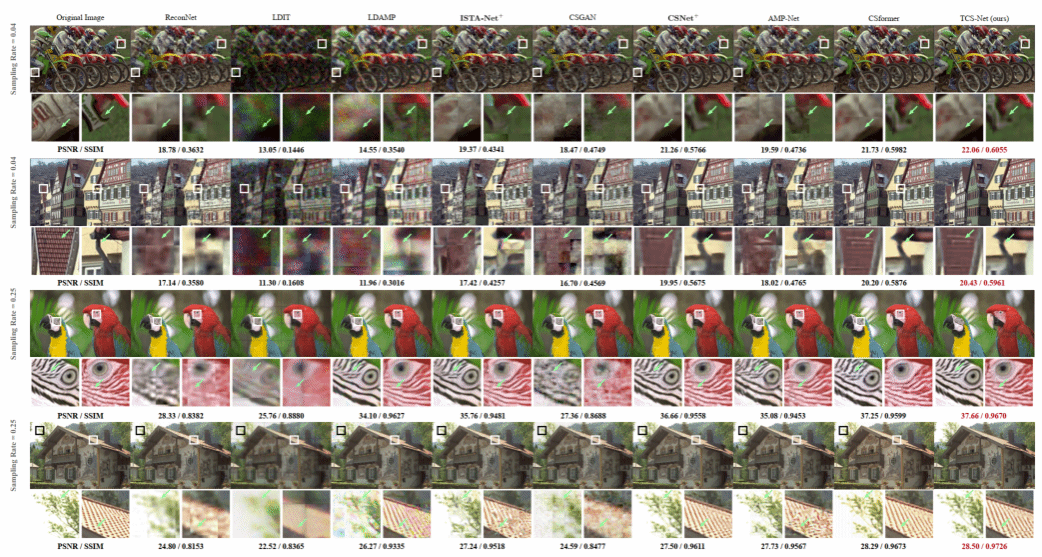 在“From Patch to Pixel: A Transformer-Based Hierarchical Framework for Compressive Image Sensing”文章(IEEE TCI)中,作者提出了一种基于Transformer的级联式图像压缩感知方法TCS-Net,该方法以级联的方式将Transformer作为特征提取器捕获自然图像的长距离特征,并最终建立精细的端到端图像压缩感知映射。该方法摆脱了固有的基于CNN的图像压缩感知模式,并取得了理想图像采样和恢复效果。论文链接: