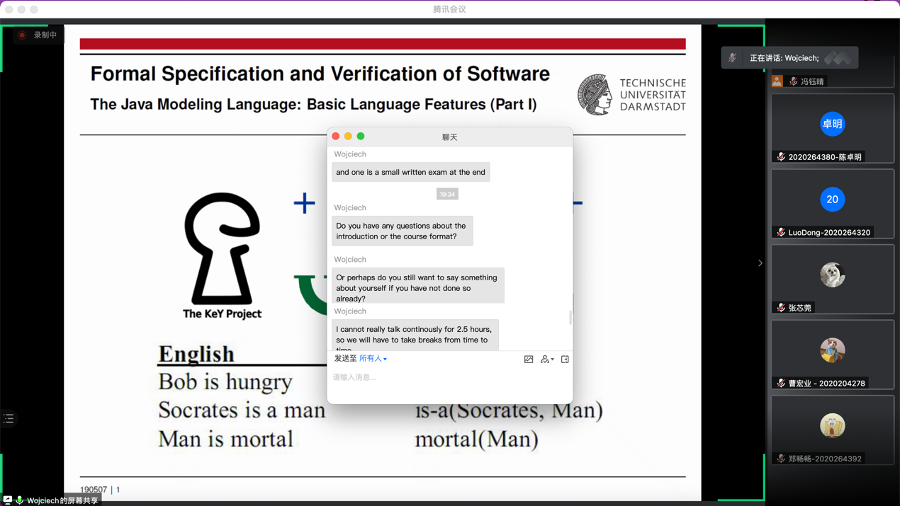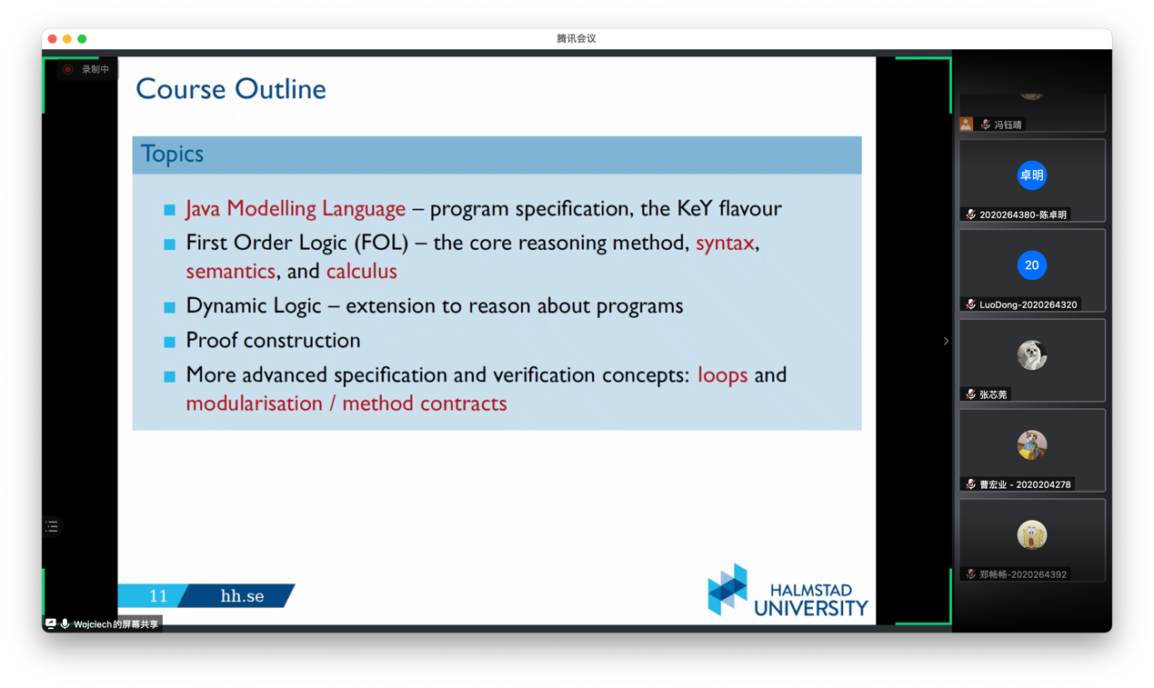 全英文课程“程序逻辑与程序形式化验证”(Formal Verification of Imperative Programs with Program Logics and Interactive Theorem Proving)在线上顺利开讲。该课程由瑞典哈姆斯塔德大学(Halmstad University)副教授Wojciech Mostowski主讲。