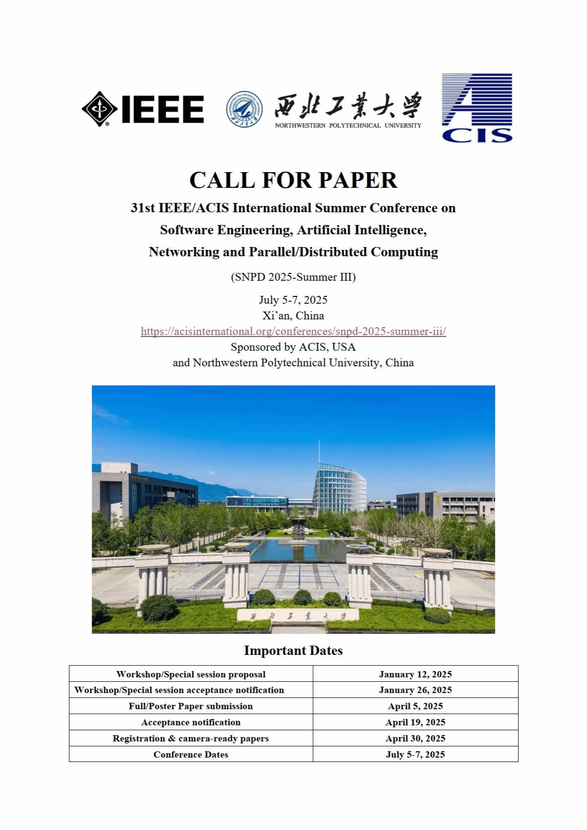 SNPD2025-Summer III 是由美国电气和电子工程师协会计算机学会(IEEE Computer Society)、国际计算机与信息科学协会(International Association for Computer and Information Science,ACIS)联合主办的国际学术会议,其历经20余年的积淀与发展,已在世界范围内建立起卓越的学术声誉和广泛的影响力。每届SNPD都有全球范围内的专家、学者、工程师以及行业精英出席,大家共同探讨最前沿的技术问题、分享最新的研究成果。被本届会议收录的部分优秀学术论文,将会被推荐投稿到IJNDC,IJSI,SCI等高水平学术源刊。大会将评选出最佳论文奖和最佳学生论文奖。