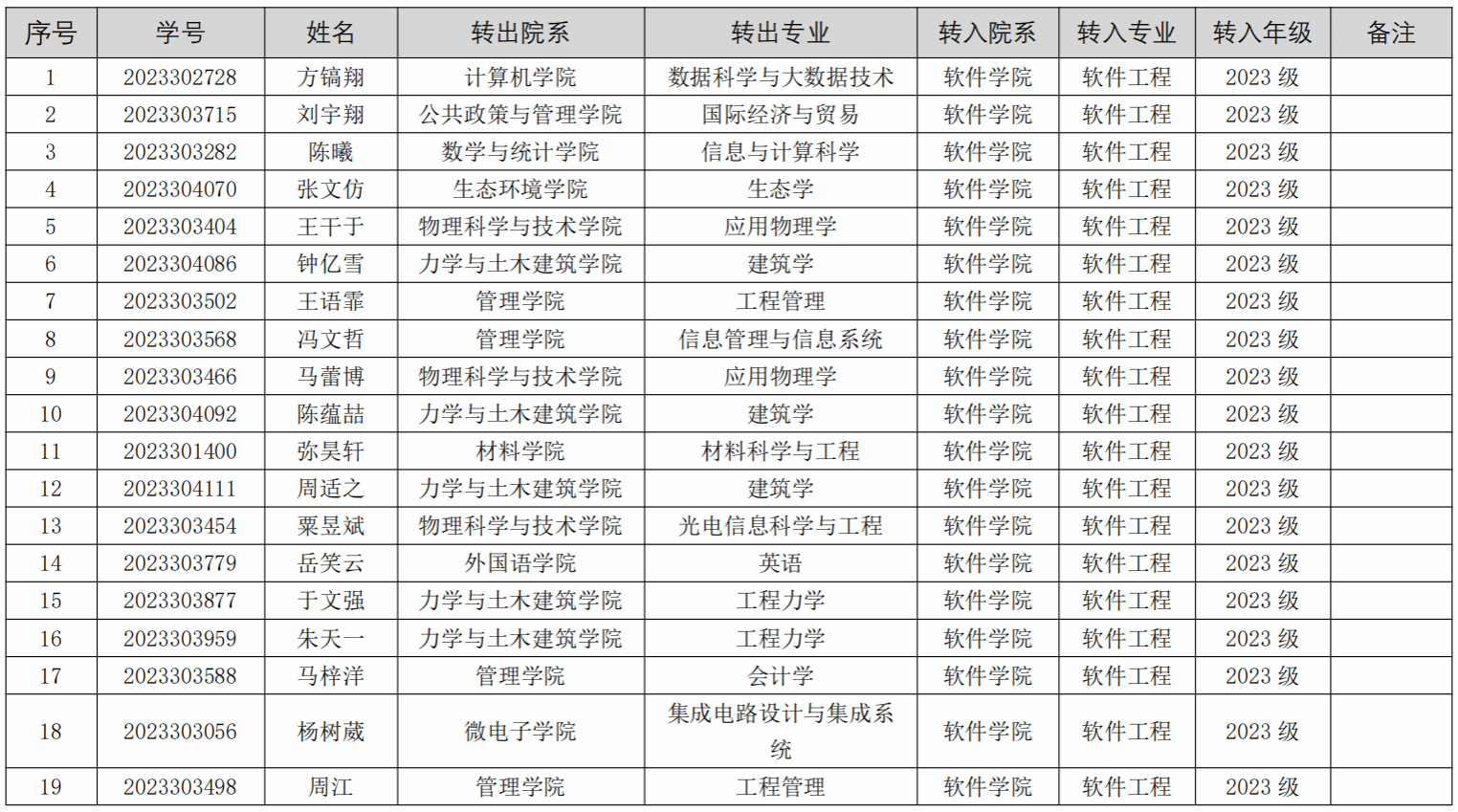 序号 | 学号 | 姓名 | 转出院系 | 转出专业 | 转入院系 | 转入专业 | 转入年级 | 备注 |